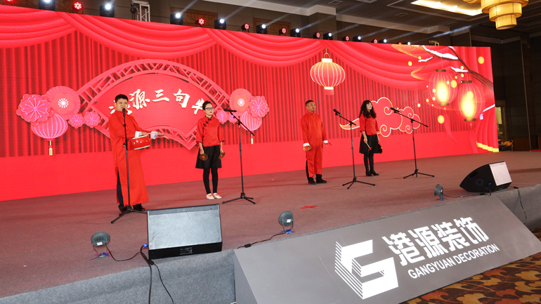 年會(huì )結束后,精彩紛呈的迎春聯(lián)歡晚會(huì )拉開(kāi)了帷幕。晚會(huì )上,13個(gè)文藝節目均由港源裝飾各單位選送。