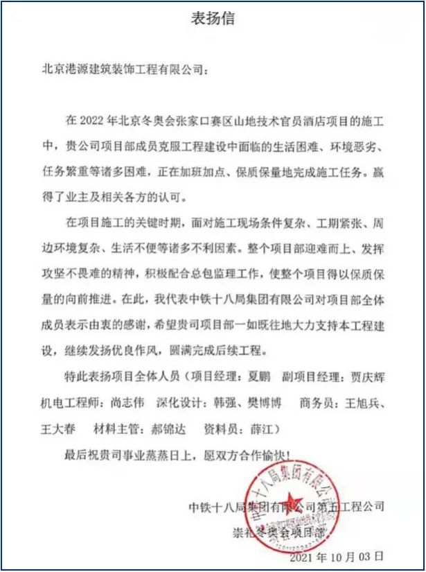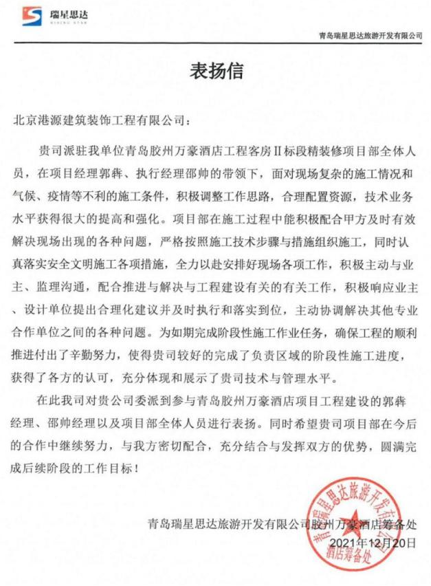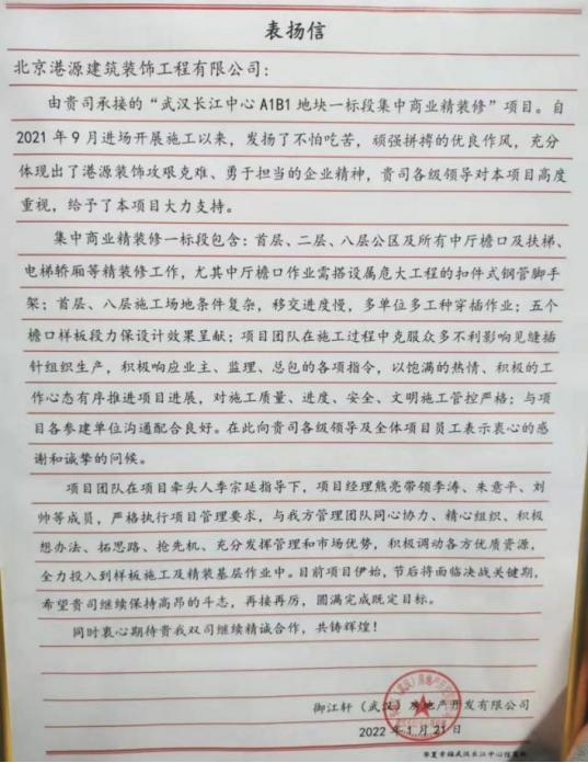 一封封表?yè)P信、感謝信,是對港源品牌的認可,也是對全體項目管理人員付出的肯定,更是鞭策我們不斷提高服務(wù)質(zhì)量的動(dòng)力。在今后的施工管理服務(wù)中,北京港源將堅持以“讓客戶(hù)更滿(mǎn)意”為宗旨,以適應客戶(hù)的多樣化需求。